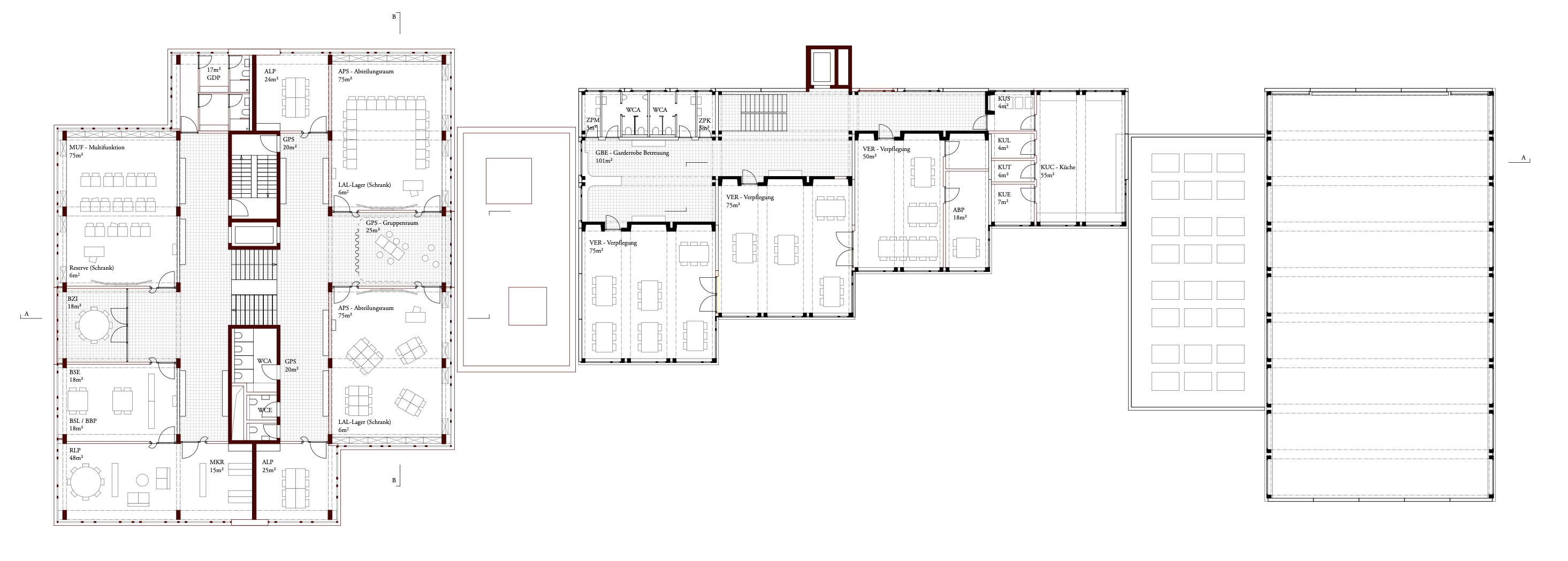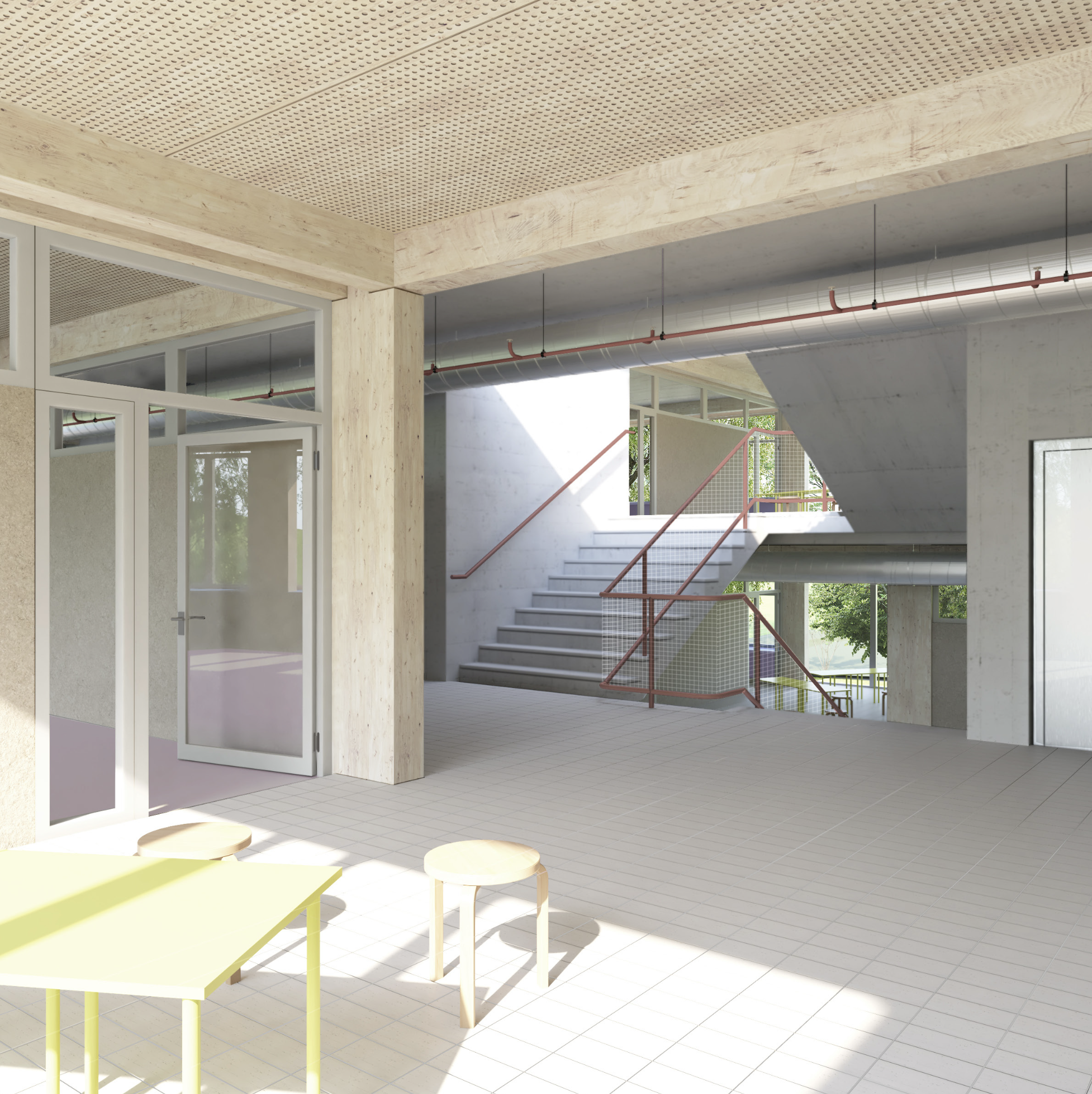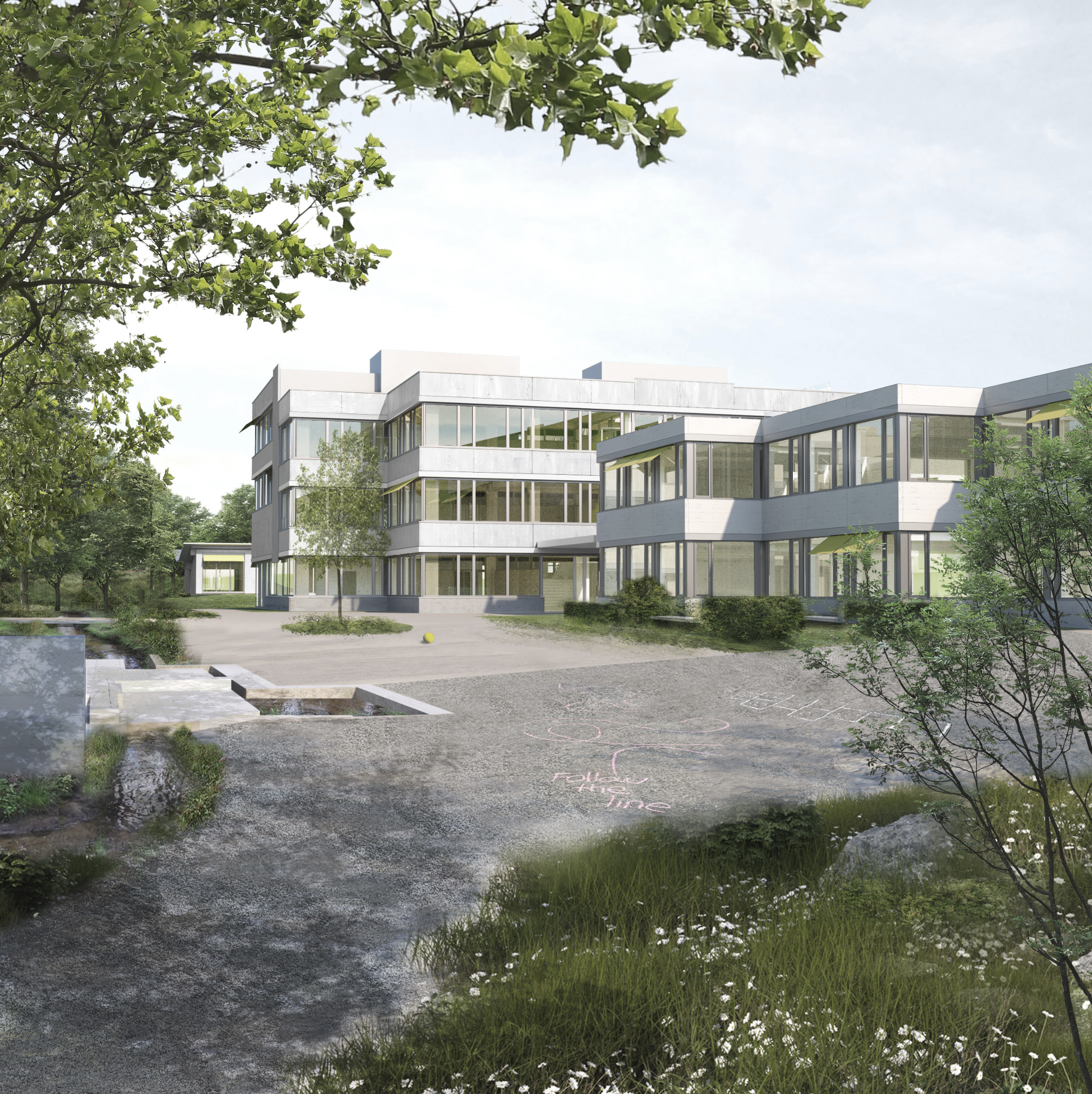 In der Talsohle des Quartiers Meierhof erstreckt sich die Parzelle der bestehenden Schulanlage Meierhof entlang des Stadtbaches. Die Anlage als Ganzes zu betrachten, bestehende Qualitäten zu stärken, spezifische Orte entlang des Bachlaufes zu schaffen und doch ein klares Zentrum zu bilden, ist ein erstrebenswertes Ziel. Der dreigeschossiger Schulbau mit Splitlevel schliesst an die bestehende Anlage an, während der leichter Kindergartenbau von den Qualitäten des angrenzenden Biotops profitiert.